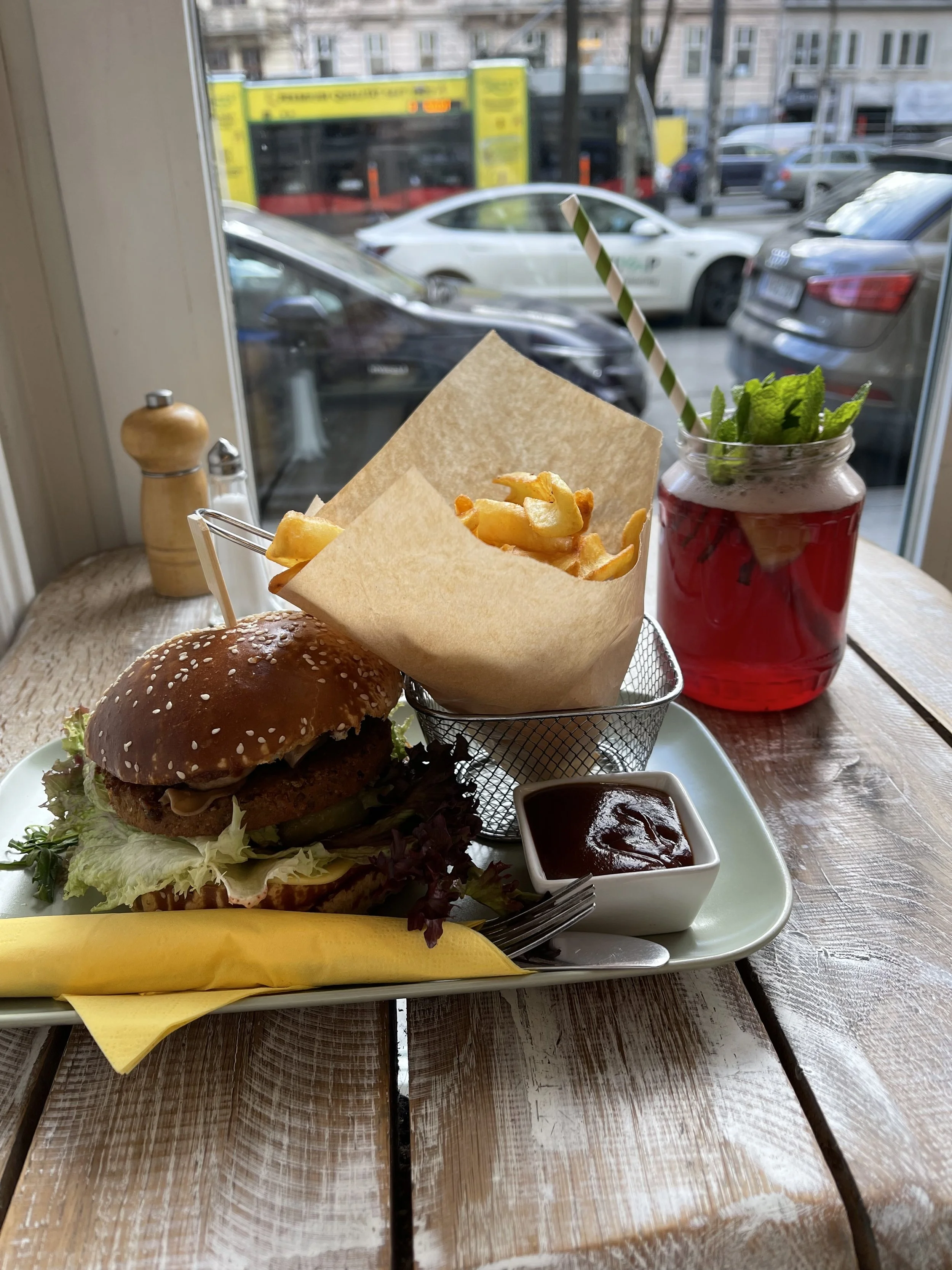 I decided it was time to move on and to leave the Opera House fiasco in the past. There was a place I had seen over the past few days called Veggiezz so I decided to check it out. I ordered a Spicy Vegan Burger with fries since I’d been craving a veggie burger. I also got a lemonade.